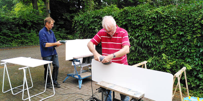 Samen met tientallen buurtgenoten werden alle aparte onderdelen van de minibieb gezaagd, geschuurd, en geschilderd.
